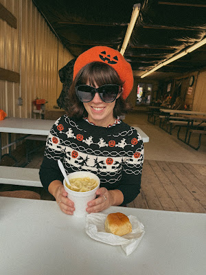 I had all my favorite foods, except we did not get a funnel cake. Breakfast was a giant cinnamon roll with hot chocolate. Then we stopped to get mashed potatoes and noodles in a cup (my favorite). I got my first pumpkin ice cream cone. And had a snack of loaded french fries and a lemon shake up. I always want to eat more when I'm there, but there isn't enough time!